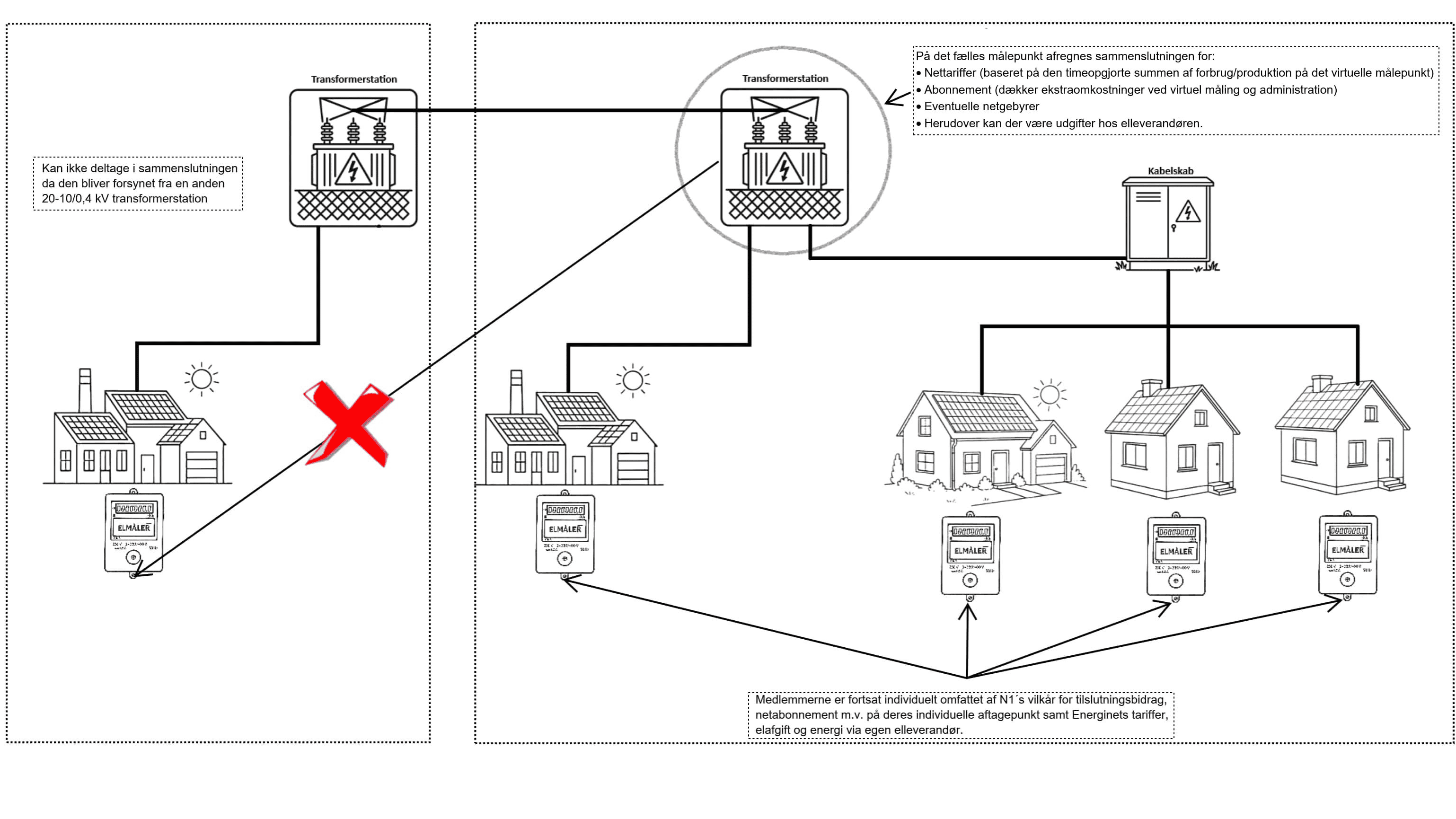 Alle netkunder i sammenslutningen skal være forsynet fra den samme 20-10/0,4 kV transformerstation (lavspænding).